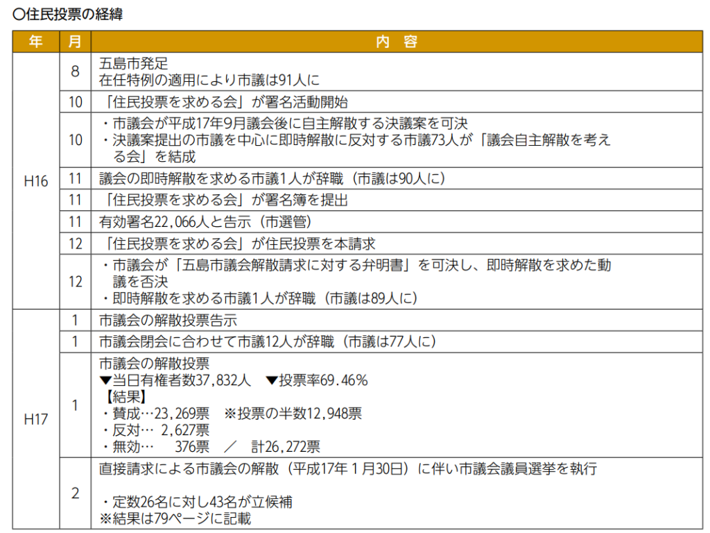 住民の署名運動が進む中、議会内の「早期解散に慎重な議員」を中心に、2005年9月定例会終了後に自主解散する方針を決議(可決)。在任特例を一定期間短縮する“妥協案”として位置づけられた一方、「住民運動は議会不信の表れ」などの反対討論も出た。200409月(五島市)定例会