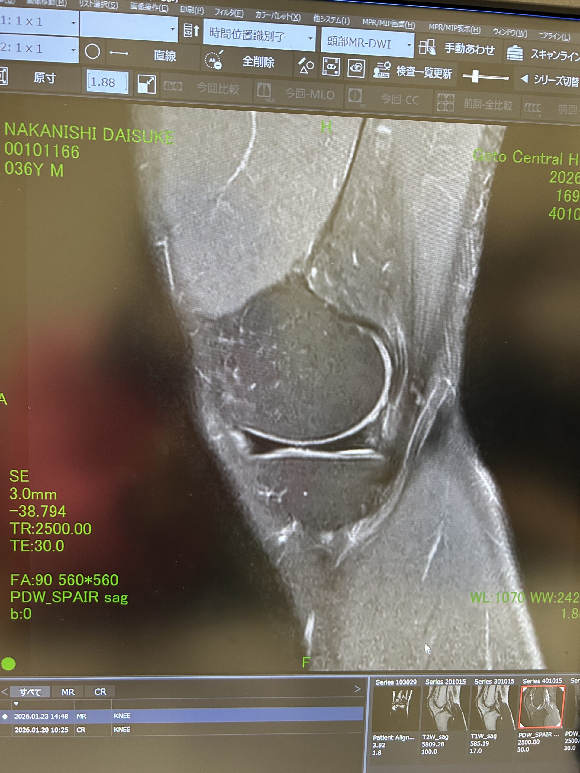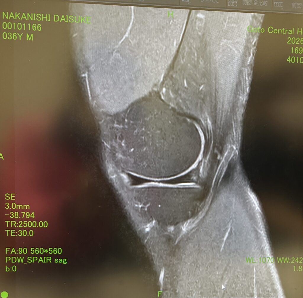 最初はランナー膝かなと思っていましたが、中々回復が遅かったので1月に五島病院でMRIを取って頂きました。